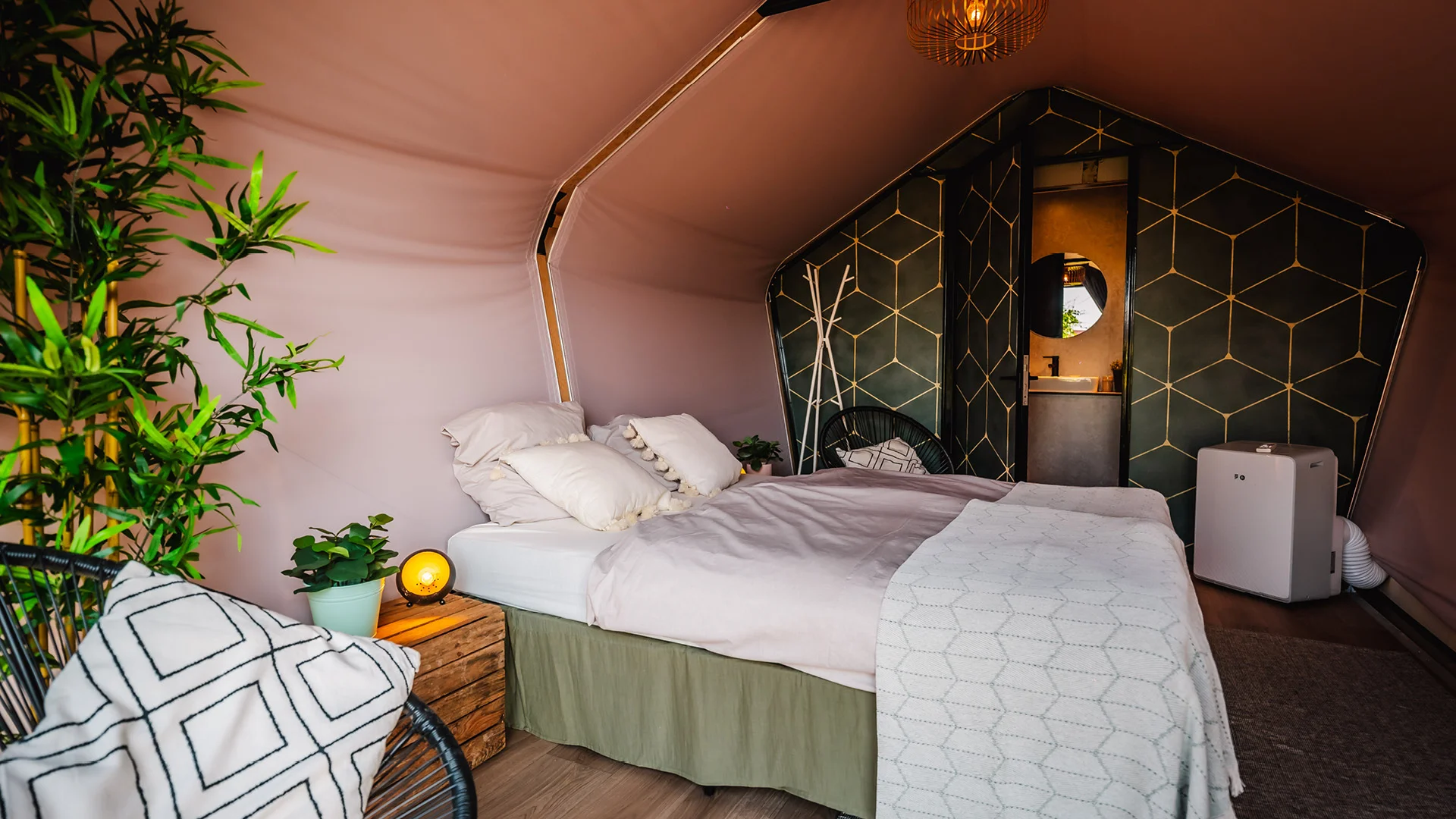 Die Diamond Suite ist das absolute Highlight im Deluxe Village – die exklusivste Unterkunft der gesamten Campsite. Hier trifft Festival auf Luxus: stilvolles Design, hochwertige Ausstattung und volle Privatsphäre. Von Boxspringbetten über Klimaanlage bis zum eigenen Bad – mehr Komfort geht nicht. Willkommen im ultimativen Glamping-Erlebnis.