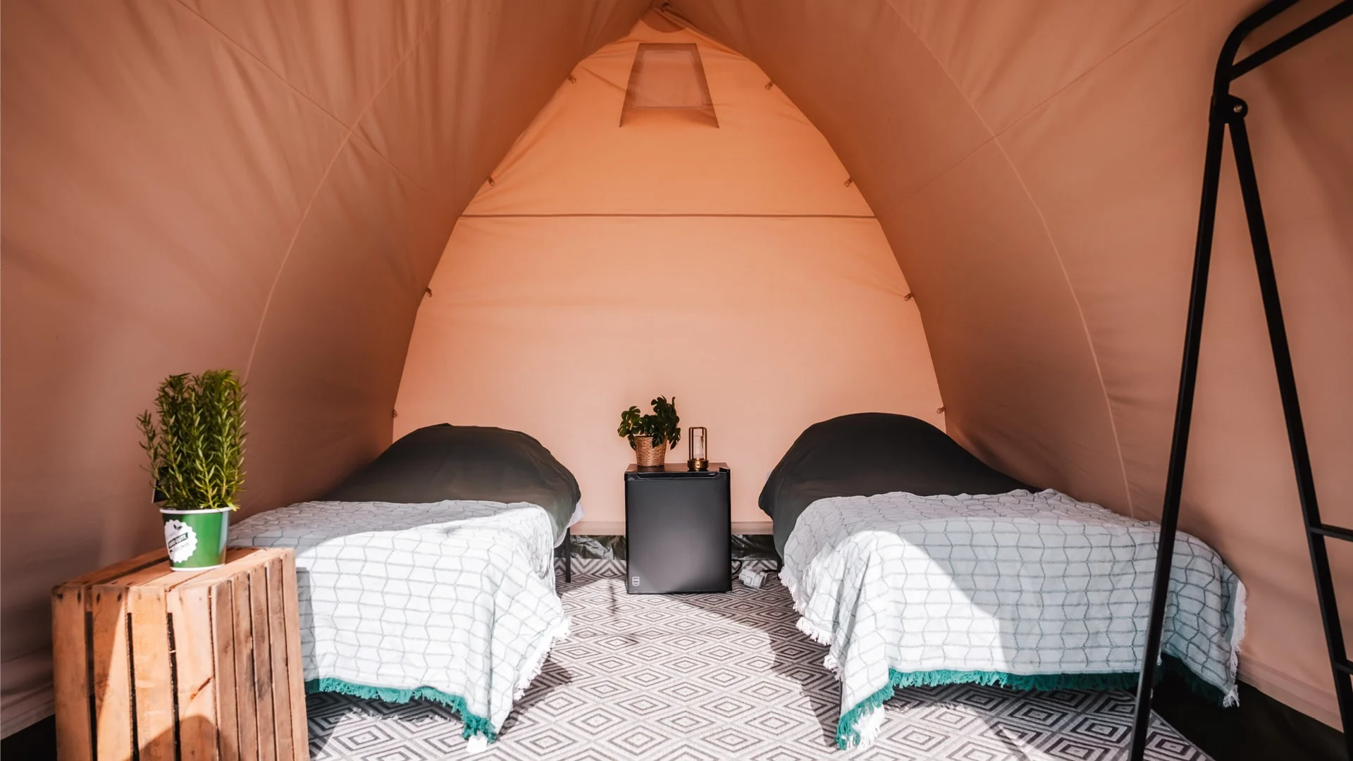 Der Deluxe Tunnel überzeugt mit seinem besonderen, länglichen Grundriss, der viel Raum und Übersicht schafft. Ausgestattet mit gemütlichen Betten, hochwertigen Möbeln und einer praktischen Kleiderstange bietet diese Unterkunft alles, was man für erholsame Festivalnächte braucht. Dank Holzboden und stilvollem Interieur entsteht ein wohliges Ambiente, das Glamping-Feeling auf den Punkt bringt.